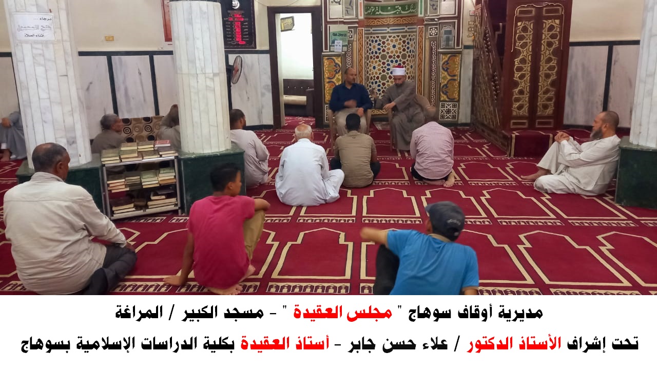 ففي مديرية أوقاف سوهاج أقيمت فعاليات مجلس العقيدة بمسجد الكبير، حاضر فيه الدكتور علاء حسن جابر أستاذ العقيدة بكلية الدراسات الإسلامية بسوهاج.